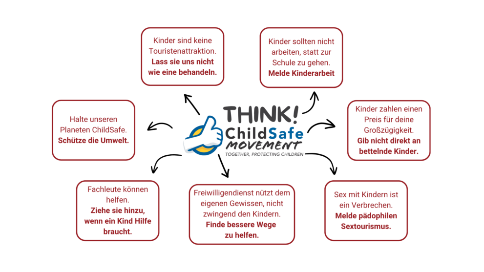 Das ChildSafe Movement hat sieben einfache Maßnahmen unter dem Titel Denk nach! zusammengestellt, um die Schwächsten der Gesellschaft vor negativen Folgen des Tourismus zu schützen: