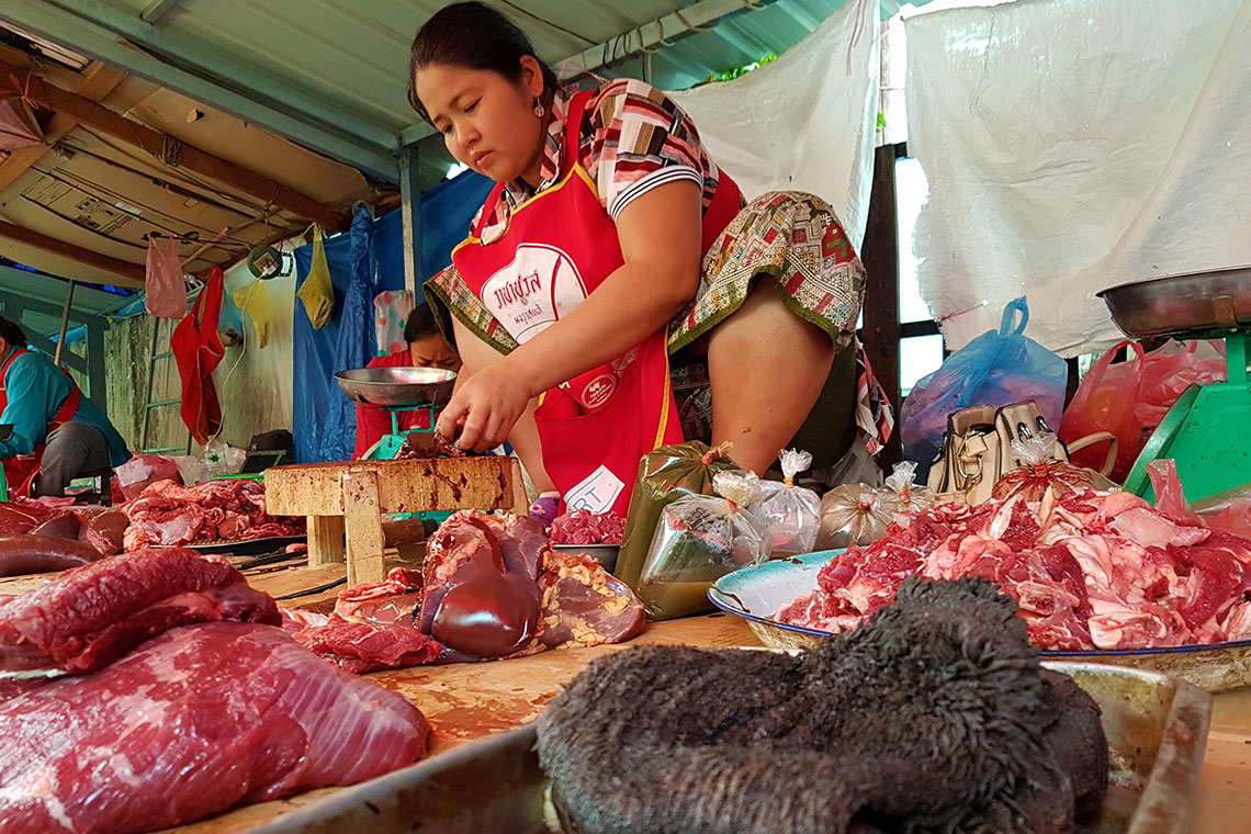 Wir treffen uns am Tiger Trail Büro in Ban That Luang. Nachdem wir Sie mit passenden Fahrrädern ausgestattet haben, radeln wir direkt zum Morgenmarkt. Hier verkaufen Bauern aus dem Umland ihre frischen Waren. Ihr Guide erklärt Ihnen die Vielfalt an Fleisch, exotischen Früchten und Kräutern, die in der laotischen Küche unverzichtbar sind. Für Mutige gibt es hier die ersten Kostproben: Frittierte Grillen, Seidenraupen oder Heuschrecken. Mit Gewürzen verfeinert sind diese überraschend knusprig und lecker – ebenso wie die Bienenlarven, eine echte lokale Delikatesse.